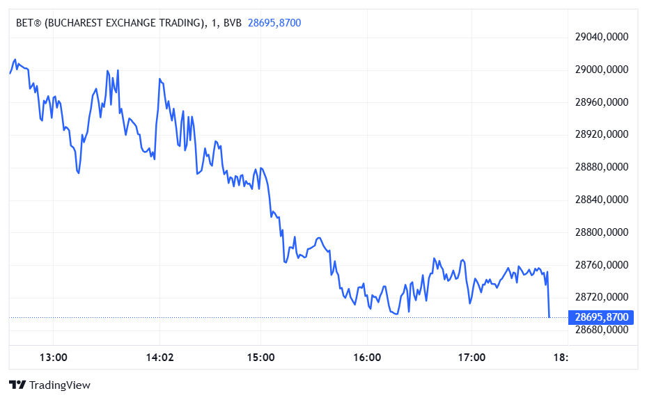 Bursa de Valori București a închis prima ședință a săptămânii pe minus. Indicele BET, principalul reper al pieței locale și indicatorul care urmărește evoluția celor mai lichide 20 de companii de pe Piața Principală, a coborât cu 1,87%, până la 28.695,87 puncte. Chiar și în aceste condiții, de la începutul anului BET rămâne pe plus, cu un avans de 17,42%.