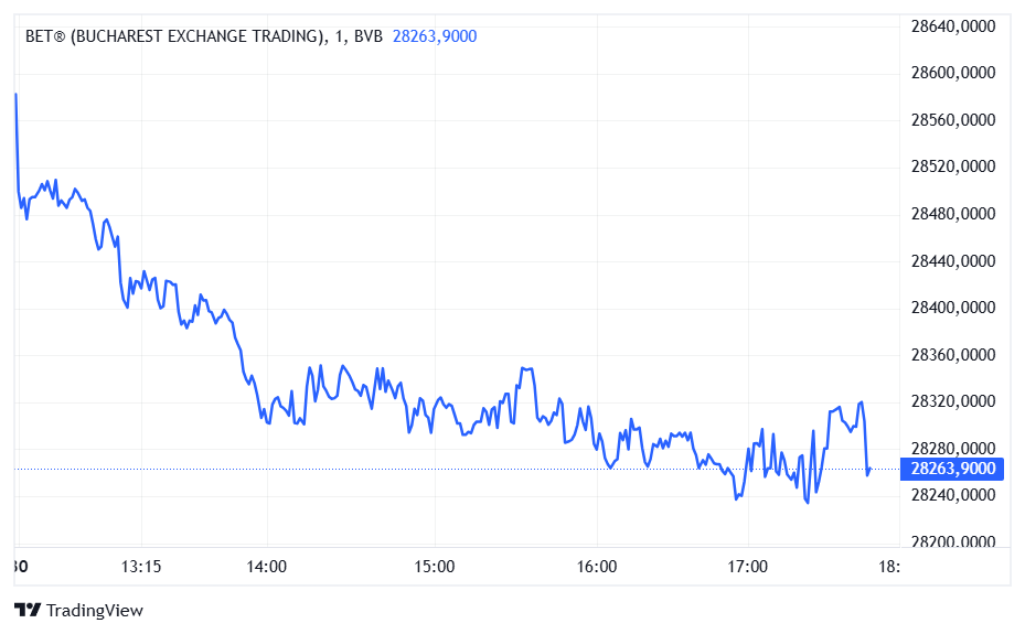 Indicele BET, care urmărește cele mai lichide companii de pe Piața Principală, a coborât cu 1,11% și a ajuns la 28.263,90 puncte. În ultima lună, BET a înregistrat un avans de 1,85%, iar în ultimul an a crescut cu 64,74%. De la începutul anului, indicele are un plus de 15,65%.