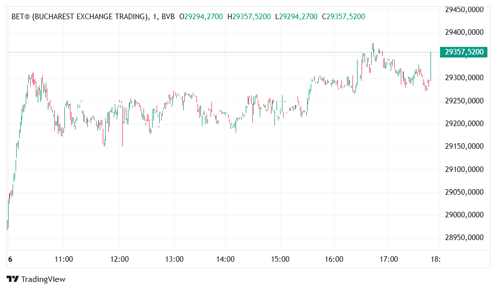 Bursa de Valori București (BVB) a închis ședința de tranzacționare de joi, 16 aprilie, pe plus la aproape toți indicatorii. Indicele de referință BET, care include cele mai lichide 20 de companii de pe Piața Principală, a înregistrat o creștere de 1,33%, ajungând la 29.357,52 puncte. Avansul de la începutul anului a fost de 20,13%. Tranzacțiile încheiate joi pe BVB au însumat 166,25 milioane de lei. Din această sumă, tranzacțiile cu acțiuni au reprezentat 139,26 milioane de lei, ceea ce a menținut ședința de joi printre cele mai active din această lună.