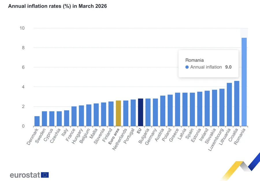 Eurostat arată că inflația anuală din Uniunea Europeană a fost de 2,8% în martie 2026. În februarie, media UE era de 2,1%, iar în martie 2025 fusese de 2,5%. România s-a aflat pe primul loc în clasamentul scumpirilor, cu o rată anuală de 9%. Pe poziția secundă s-a situat Croația, cu 4,6%, iar Lituania a urmat cu 4,4%. Diferența dintre România și Croația a fost de 4,4 puncte procentuale. Practic, România a avut o inflație de peste trei ori mai mare decât media Uniunii Europene.